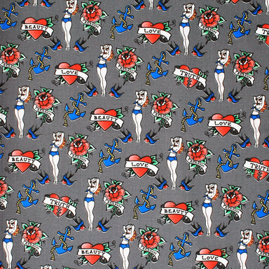 View full detailsA fun vintage style print inspired by the tattoos of old sailors. An edgy alternative to the traditional nautical style. 100% Cotton Width 148cm P...